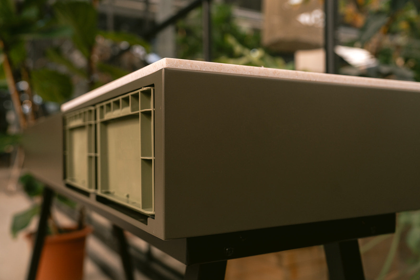 Designed with functionality in mind, the Gardenworks Station features a planter and worktop at a convenient 93 cm height, with space underneath for two crates. This combination makes it ideal for both gardening and outdoor cooking. The planter’s drainage system ensures optimal hydration for your plants—excess water flows through two outlets while maintaining a reserve layer for your plants to absorb, keeping them healthy and thriving.