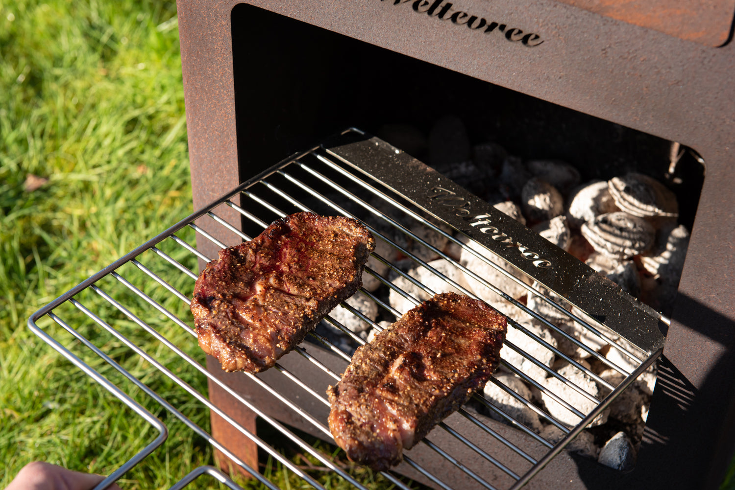 Step 2: Cover the marinated meat with oil (on both sides). Place on the grill rack and grill the meat inside the Outdooroven over briskets or hot charcoal as you would with a normal barbecue. Grill for 5 minutes for a medium bake and flip hallway through. Take out the meat and leave to rest for 5 minutes, covered by tin foil.