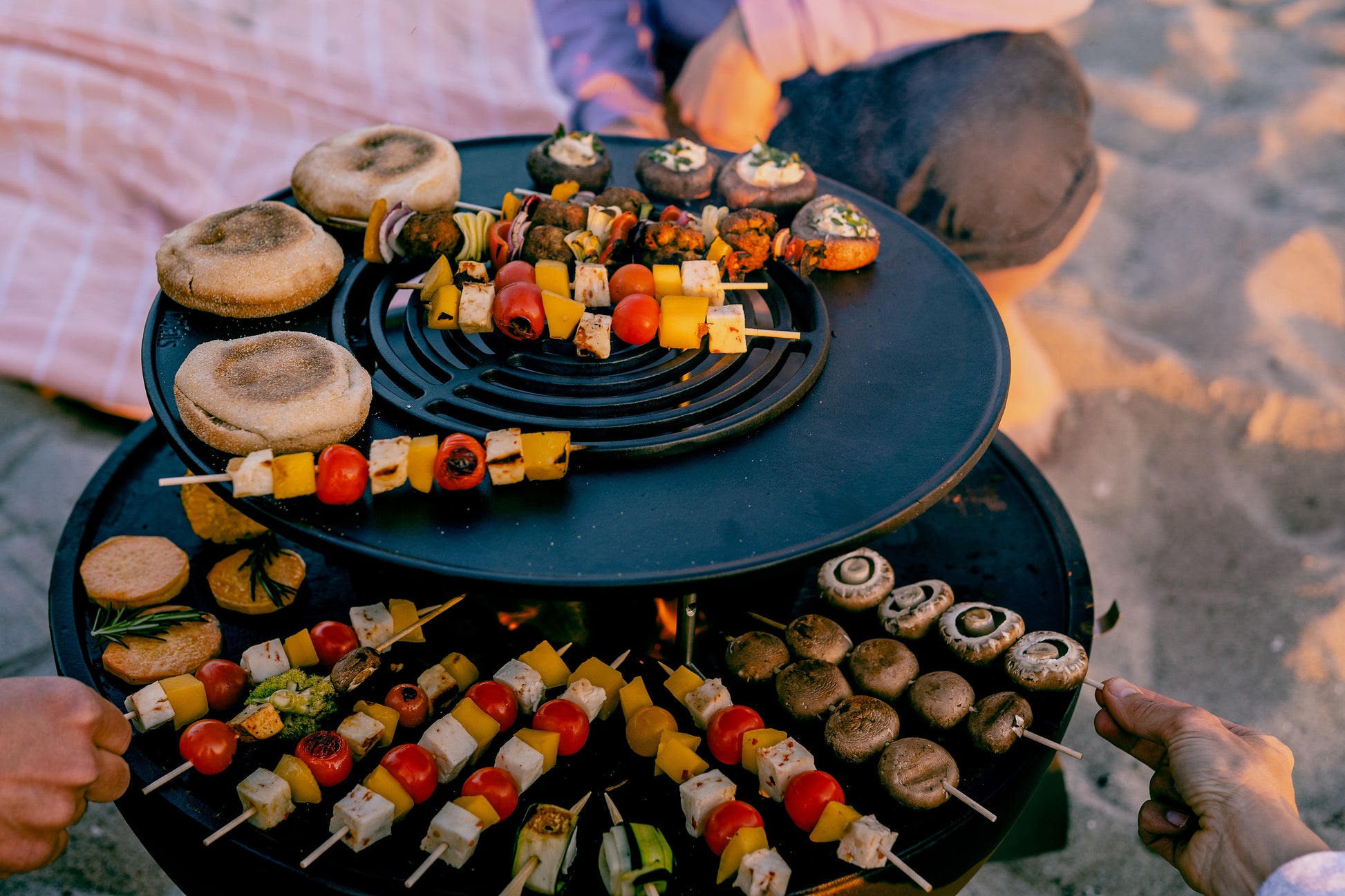 Creates an additional cooking surface alongside the plancha ring — position it directly over the fire or within the plancha ring opening.
