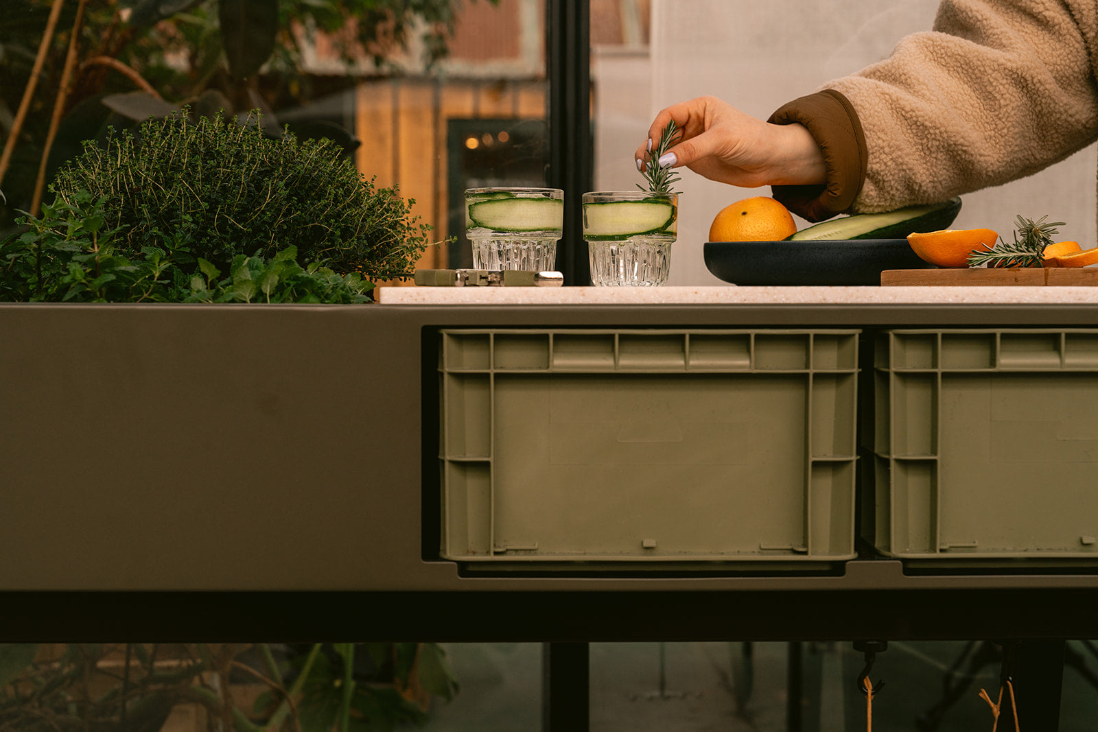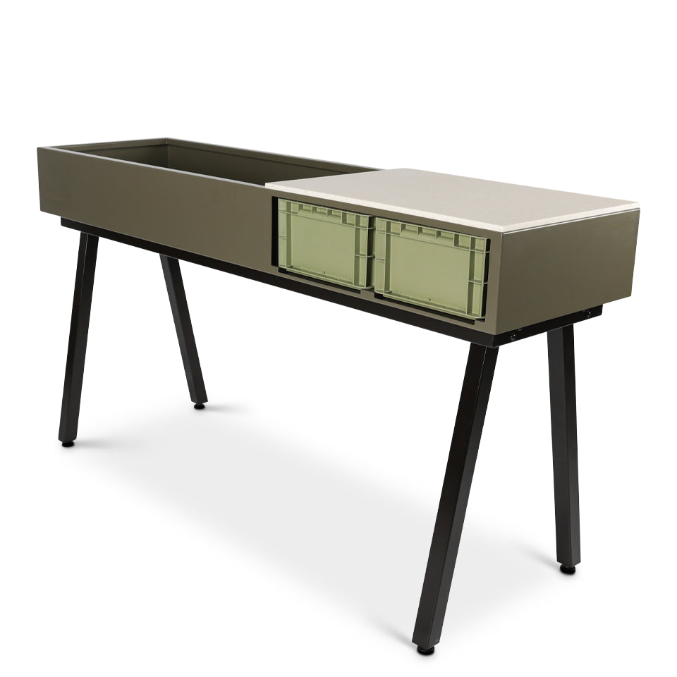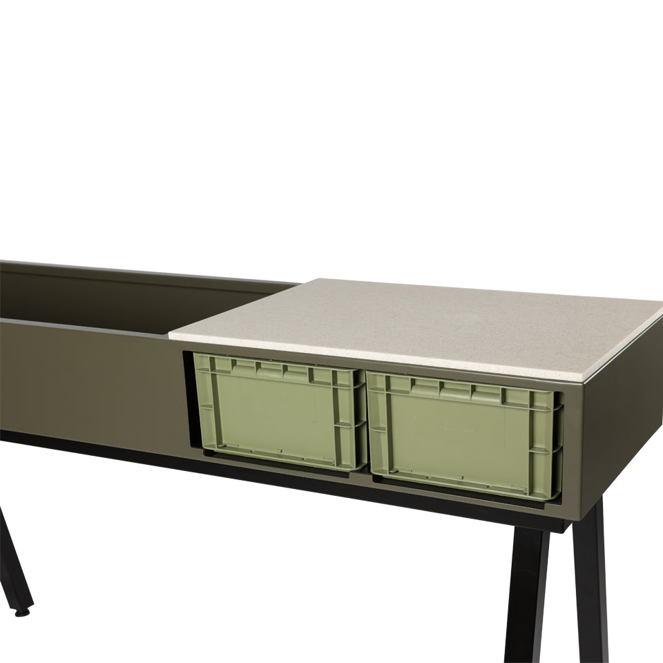 Designed with functionality in mind, the Gardenworks Station features a planter and worktop at a convenient 93 cm height, with space underneath for two crates. This combination makes it ideal for both gardening and outdoor cooking. The planter’s drainage system ensures optimal hydration for your plants—excess water flows through two outlets while maintaining a reserve layer for your plants to absorb, keeping them healthy and thriving.
